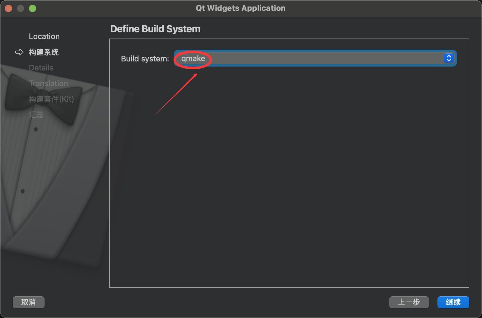第二步构建系统时,"build system" 选择 "qmake",其他可以默认。