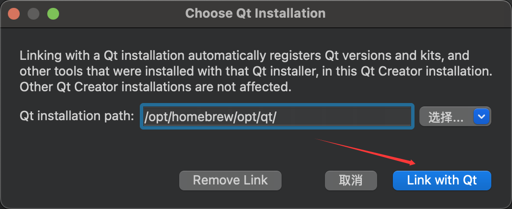 输入“/opt/homebrew/opt/qt” ,点击"link with Qt"